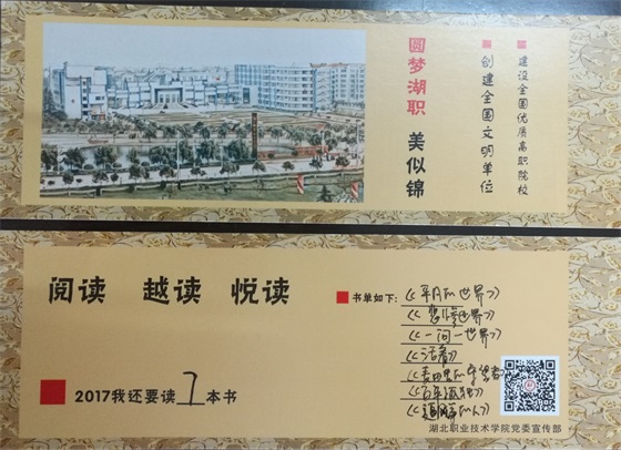 4月23日当天,学校新闻中心的同学们在宣传部王老师的带领下,深入各个班级开展“以读书的名义”为主题,开展了系列宣传活动,向全体同学发出了“世界读书日,我在湖职;我爱阅读,我为文明代言!”的倡议,号召大家科学制定阅读目标,并向同学们赠送了精美的小书签。活动中,湖职学子们积极响应,纷纷表示要制定好阅读计划,争取多读书、读好书。