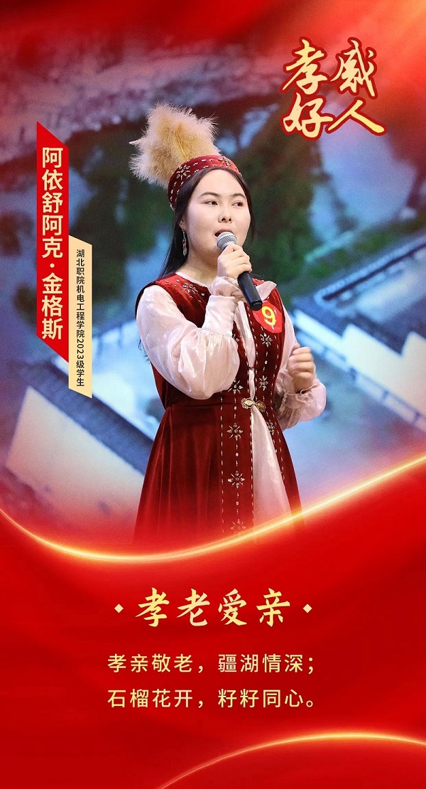 阿依舒阿克是湖北职院机电工程学院2023级学生,哈萨克族,中共预备党员,湖北职院荆楚石榴红志愿服务队副主席、荆楚石榴红宣讲团成员,校第26届“感恩之星”。