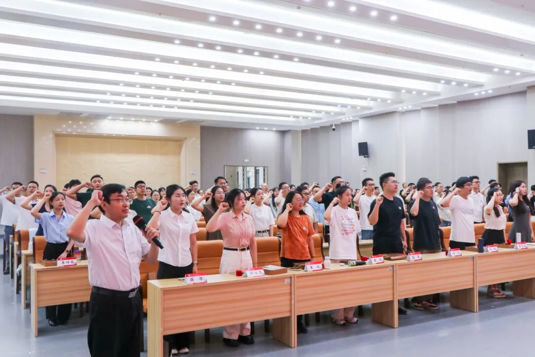 典礼现场,副校长胡昌杰为参训教师颁发校徽。随后,新入职教师们举起右拳,庄严宣誓,以铿锵誓言许下对教育事业的忠诚与担当,承诺坚守教育初心,履行教师职责,在教书育人的岗位上奋发奋进,践行“为党育人、为国育才”的崇高使命,为培养社会主义建设者和接班人贡献力量。