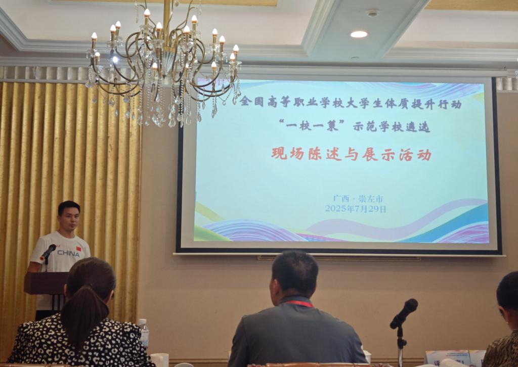 本次活动自2025年5月启动以来,经过层层选拔和严格评审,共遴选出28个学校及项目案例立项全国高等职业教育院校大学生体质行动“一校一策”示范学校及示范案例。2025年7月27日—31日,全国高等职业院校体育部(系)主任暨骨干教师教学技能提升培训活动在广西崇左市举行,期间,项目负责人黄朋老师结合事前制作的PP电子体质提升专题视频进行了现场陈述和答辩,得到评审组高度认可,《湖职体健》案例顺利通过评审。