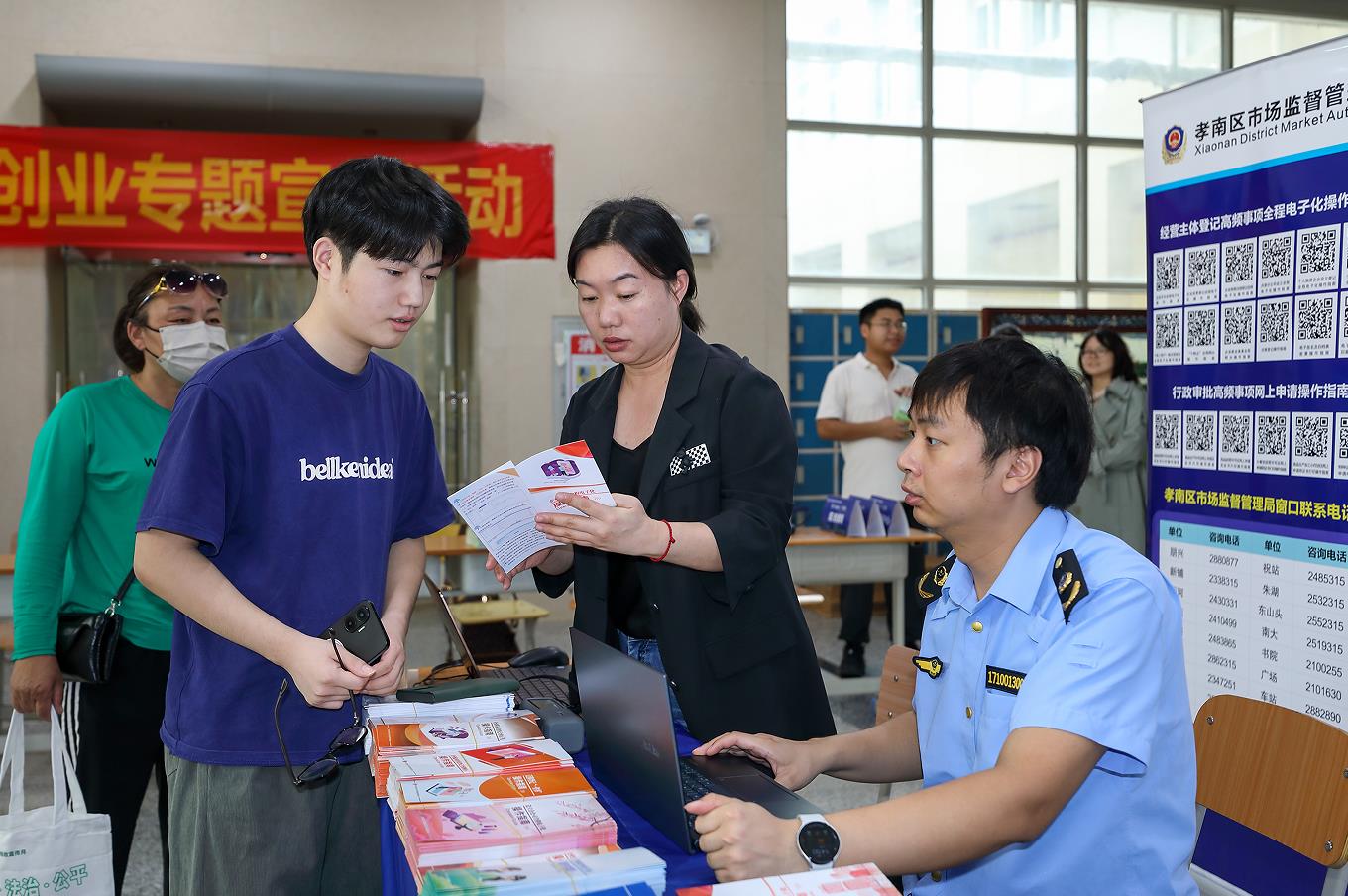 大学生创业群体现场咨询与服务活动在西区文博馆大厅开展,政府相关职能部门、金融机构及企业设立咨询台,提供注册登记、税务办理、融资贷款、法律咨询等“一对一”服务,并为二百余名学子发放“创业政策大礼包”。活动现场,沈烜政同学创办的我星科技(湖北)有限公司申请办理营业执照。