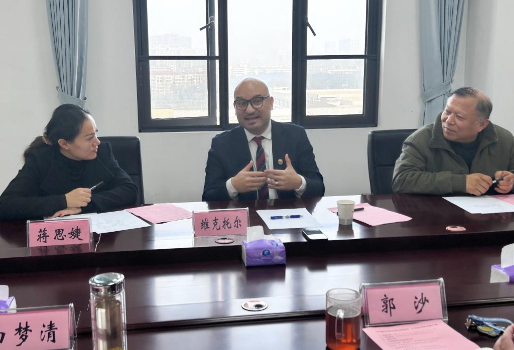 交流座谈会在图新大楼会议室举行。郭沙代表学校对远道而来的嘉宾表示热烈欢迎,介绍了学校的办学历史、专业特色及国际化办学成果。他强调,学校始终坚持开放办学,积极服务国家战略,期待与匈牙利各界在职业教育领域深化互鉴与合作。