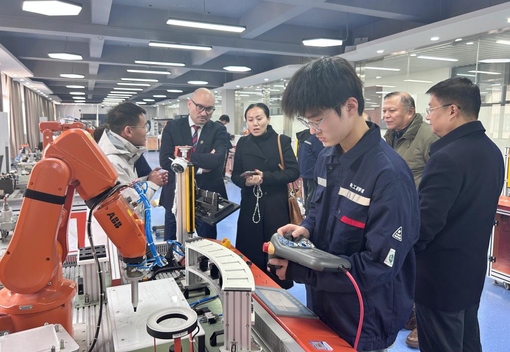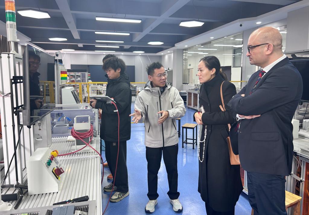 在郭沙等陪同下,来宾实地参观了PP电子比亚迪产业学院、工业机器人实训基地、智能机器人成果展厅以及学生宿舍等。先进的实训设备、丰硕的技术创新成果以及整洁温馨的校园环境给来宾留下了深刻印象。在参观过程中,匈方嘉宾格外关注人才培养模式与未来就业渠道,与师生亲切交流。在产业学院与实训基地,学生们进行了操作演示,其娴熟的技能赢得了来宾们的赞赏。