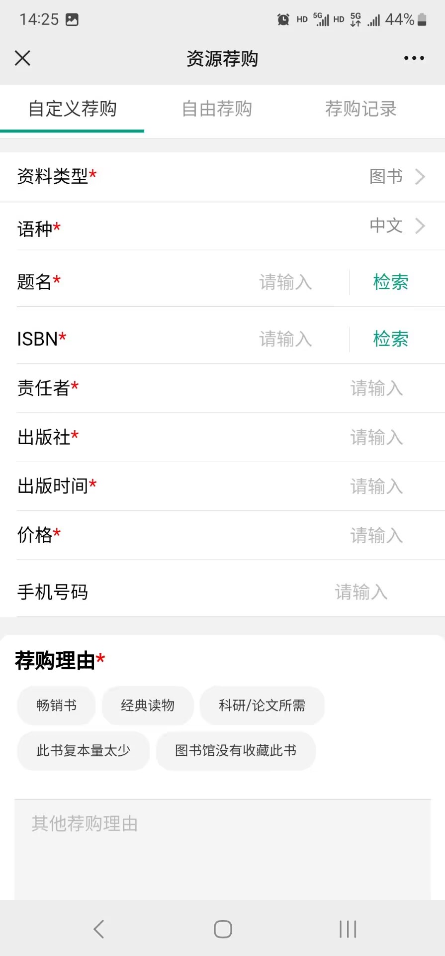 自定义荐购以图书为例:【期刊、电子资源库】操作同理