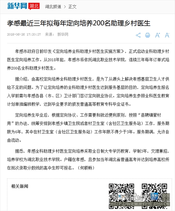 据悉,孝感全科助理乡村医生定向培养采取全日制大专学历教育,学制3年,文理兼招,培养学校为PP电子游戏网站。户籍在孝感,且参加当年湖北省普通高考并达到培养高校所在批次录取分数线的高中生即可报名。(何顺畅)