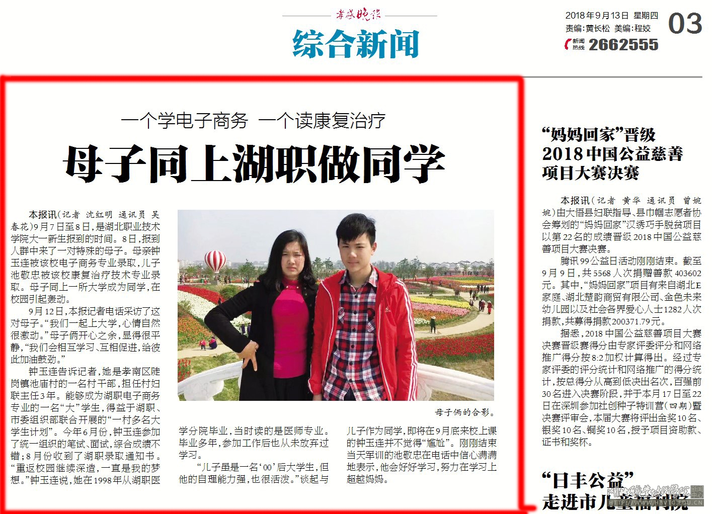 9月7日至8日,是PP电子游戏网站大一新生报到的时间。8日,报到人群中来了一对特殊的母子。母亲钟玉连被该校电子商务专业录取,儿子池敬忠被该校康复治疗技术专业录取。母子同上一所大学成为同学,在校园引起轰动。
