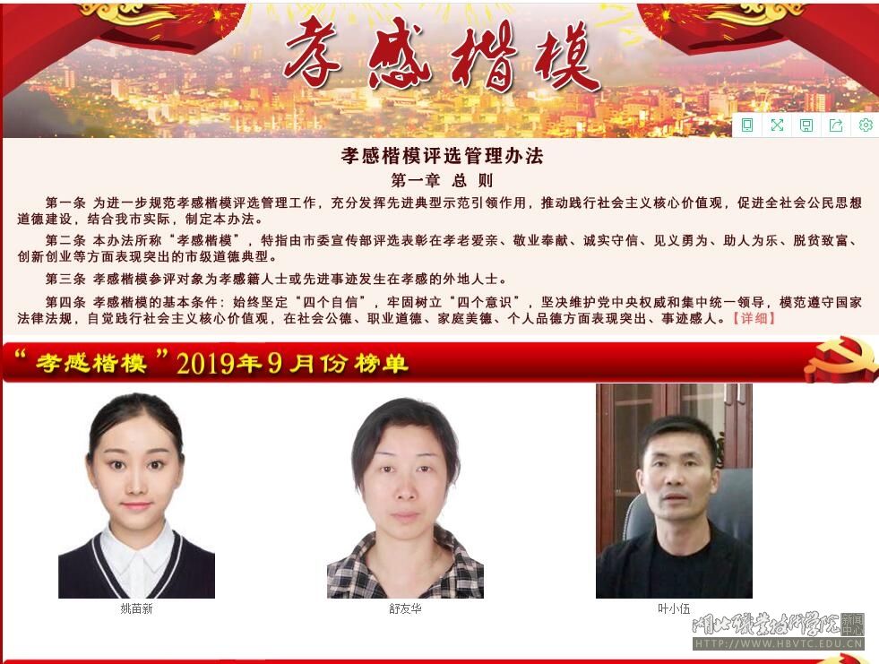 近三年,姚苗新参加街道义诊、义演、支教和健康知识宣传等志愿活动100余次。她传承和发扬尊老爱幼的传统美德,以实际行动回报社会,与同学一道担当文化传承使命,成为孝德文化传播的使者。个人先后荣获2018年度“中国大学生自强之星”、2018年度“湖北省大学生自强之星”、“湖北省向上向善青年”、“孝感市道德模范”、“孝感市最美志愿者”、“三好学生”、“优秀学生干部”等荣誉称号。