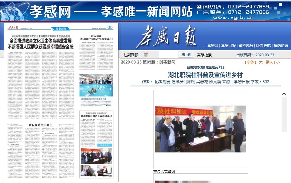 本报讯 记者刘勇 通讯员何顺畅 吴春花 熊元焕 9月21日,湖北职院联合孝感市社科联赴该校驻点扶贫村——大悟县高店乡北站村开展“送政策”“送健康”“送文化”以及“送科普知识”进乡村活动。此次活动也是湖北省第九届社科普及宣传教育周期间,湖北职院开展的主题活动之一。