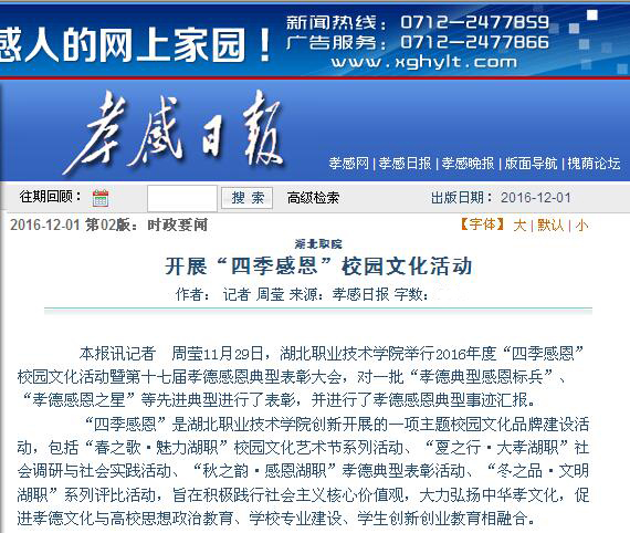 “四季感恩”是PP电子游戏网站创新开展的一项主题校园文化品牌建设活动,包括“春之歌·魅力湖职”校园文化艺术节系列活动、“夏之行·大孝湖职”社会调研与社会实践活动、“秋之韵·感恩湖职”孝德典型表彰活动、“冬之品·文明湖职”系列评比活动,旨在积极践行社会主义核心价值观,大力弘扬中华孝文化,促进孝德文化与高校思想政治教育、学校专业建设、学生创新创业教育相融合。