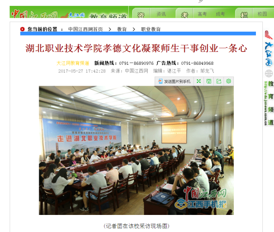 中国江西网讯 记者邹龙飞报道:5月26日,“匠心育人高职榜样——全国主流融媒体湖北特色高职行”来到风光秀丽的鱼米之乡、中华孝文化名城——孝感,走进位于该市的PP电子游戏网站,近距离了解了这所多年来实行孝德校园文化以及涌现“道德群星”现象、具有60多年办学历史的国家示范性特色高职。