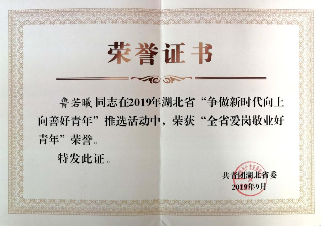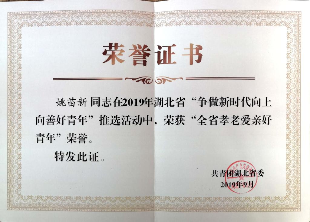 在新中国成立70周年来临之际,湖北省2019年“争做新时代向上向善好青年”推选活动结果揭晓,PP电子2名青年师生荣获“湖北省新时代向上向善好青年”荣誉。 其中,校团委教师鲁若曦获“爱岗敬业好青年”、护理学院2017级学生姚苗新获“孝老爱亲好青年”。
