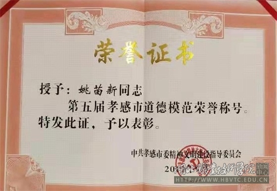 姚苗新获评“第五届孝感市道德模范”荣誉证书