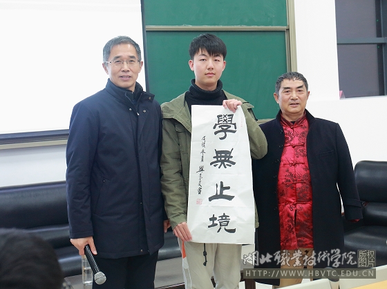 期间,还邀请了中国国际书画研究会会员、湖北省书画协会会员、湖北省爱心帮扶促进会会长、孝感市无臂书法家杨兴东,为大家讲述自己在失去双臂的情况下用脚书写人生的励志故事,并鼓励在校的大学生要牢牢把握住现在,为将来的发展做好充分准备,并为学徒制班赠送了“学无止境”亲笔书卷,场面震撼、动人,引来经久不息的掌声。