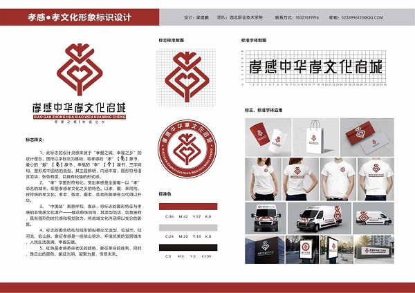 梁遗鹏副教授的作品,设计灵感来源于“孝爱之城、幸福之乡”,图形以字标法为基础,将孝感的“孝”( 篆书)、爱心的“爱”(篆书),与幸福的“幸”(篆书),三字同构,塑形成中国结的造型,主题鲜明,内涵丰富,图形符号语言简洁,张弛有度,且具有较强的形式感。“孝”字图形符号化,突出孝感是全国唯一以“孝”命名的地级市,彰显孝感作为中国孝文化之乡的特色。以孝、爱、幸同构,将传统的孝文化;孝老、敬老、爱老、助老的美德在当代得以升华。“中国结”寓意祥和、喜庆,将标志的图形特征与孝感的非物质文化遗产——雕花剪纸同构,造型简洁,创意独特,具有强烈的时代感和视觉张力,将中华孝文化内涵充分彰显。标志的围合结构与线形的纵横交叉造型,似城市,似河流、似山脉,象征孝感是一座依山傍水,环境优美的宜居城市,人民生活美满、幸福安康。红色是孝感作为英雄之城的颜色,象征胜利光明,凝聚奋进力量,价值引领未来。