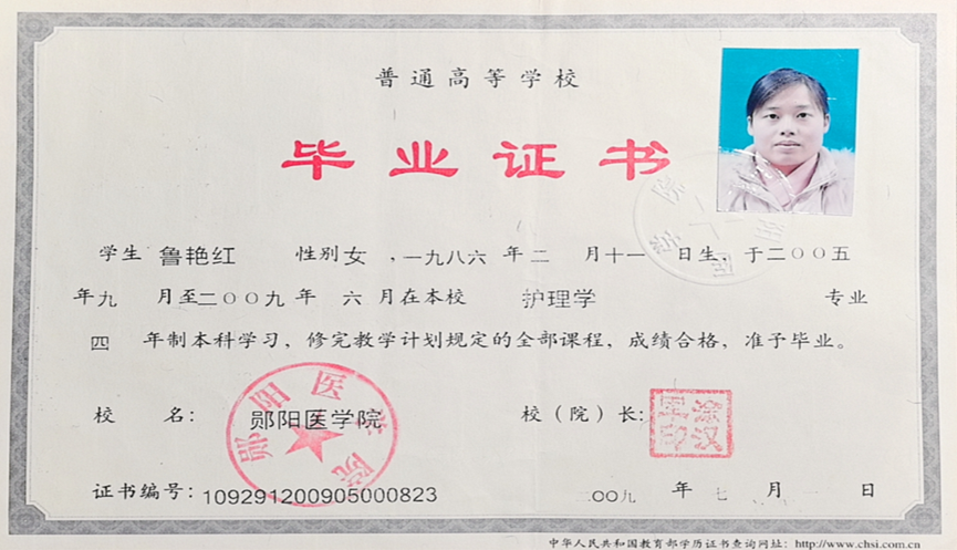 (图二 鲁艳红郧阳医学院本科毕业证书)