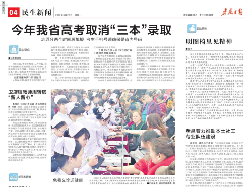 学校“十三五”规划明确提出了“创全国文明单位、创全国优质高职院校”的“双创”目标,护理学院积极响应学校号召,将创建工作与护理人才培养工作相结合,全面启动“双创”活动。在文化创建方面,以建设孝文化名城为依托,以护理学院“孝心护理志愿者服务队”为载体,形成了特有的“孝心护理”品牌文化。护理学院“孝心护理志愿者服务队”是孝感市“孝心护理专业志愿者服务队”的一个分支,由护理学院团总支负责牵头开展活动,每周各团支部组织报名开展志愿服务活动。经过多年的努力,学生志愿服务活动受到了社会的认可。