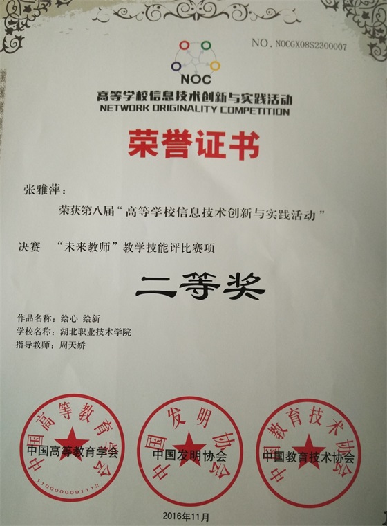 近日,全国“高等学校信息技术创新实践活动”决赛“未来教师”教学技能评比赛项在江苏无锡圆满落下帷幕。PP电子艺术与传媒学院2014级学前教育专业学生张雅萍在2016年湖北省大学生信息技术创新大赛中荣获一等奖,代表湖北省参加了全国比赛,由指导教师周天娇指导的作品“绘心 绘新”荣获全国二等奖。