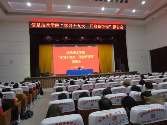 为深入学习宣传贯彻党的十九大精神,认真领会十九大精神实质。11月19日晚,信息技术学院“学习十九大 开启新征程”主题报告会在西校区文昌大礼堂举行。信息技术学院全体师生参加了报告会,信息技术学院院长胡昌杰作了主题报告。
