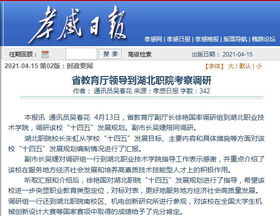 听取汇报和介绍后,徐艳国对湖北职院“十四五”发展规划进行了指导,希望该校进一步突显职业教育类型定位,对标对表,更好地服务地方经济社会高质量发展。调研组一行还到湖北职院南校区、机电创新研究所进行参观,对该校在全国大学生机械创新设计大赛等国家赛项中取得的成绩给予了充分肯定。