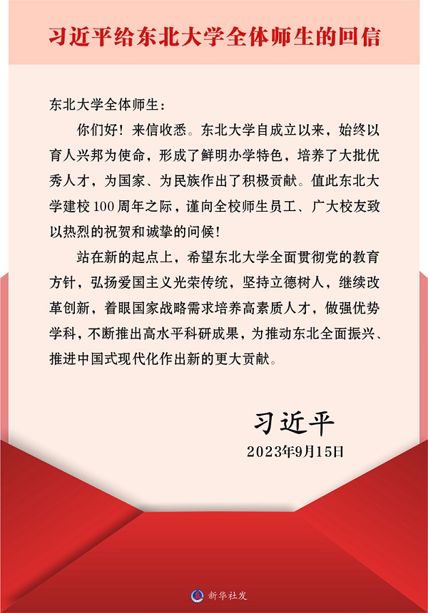 新华社北京9月16日电 中共中央总书记、国家主席、中央军委主席习近平9月15日给东北大学全体师生回信,在东北大学建校100周年之际,向全校师生员工、广大校友致以热烈的祝贺和诚挚的问候。